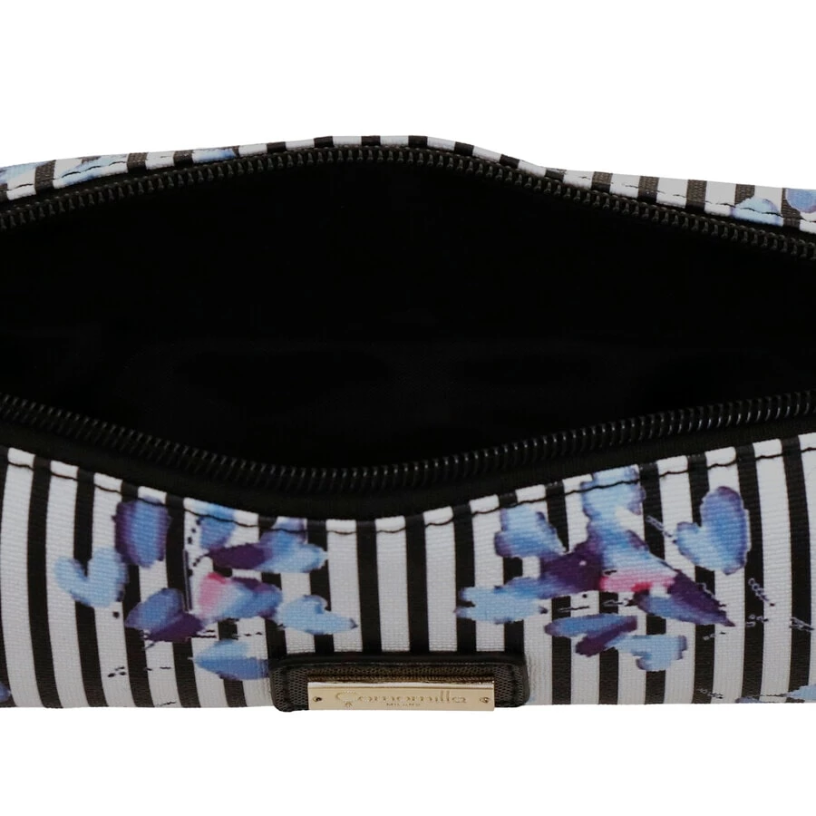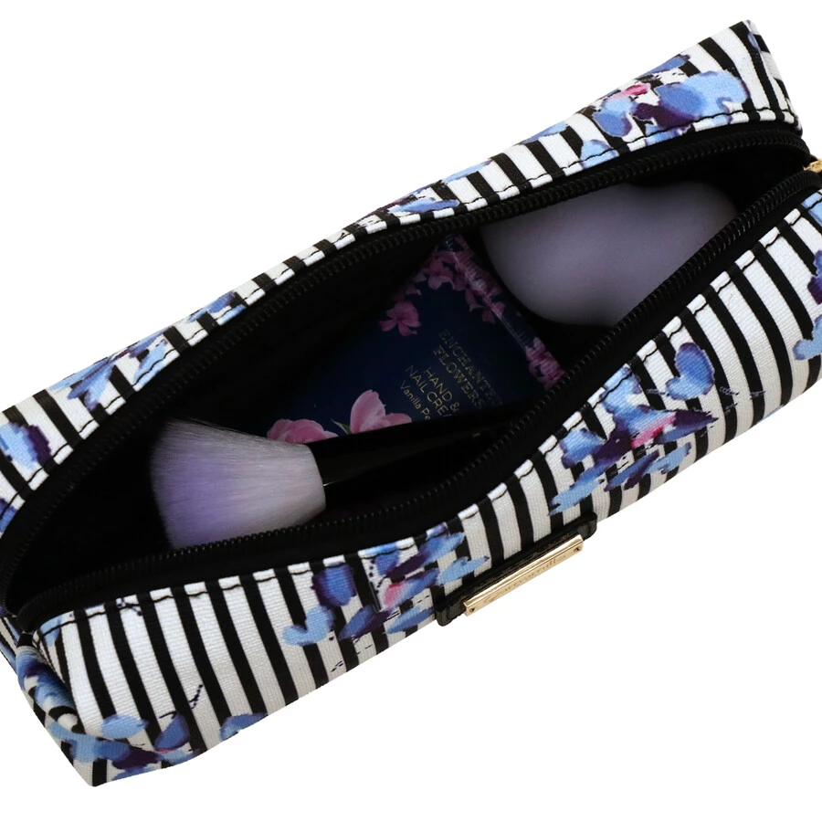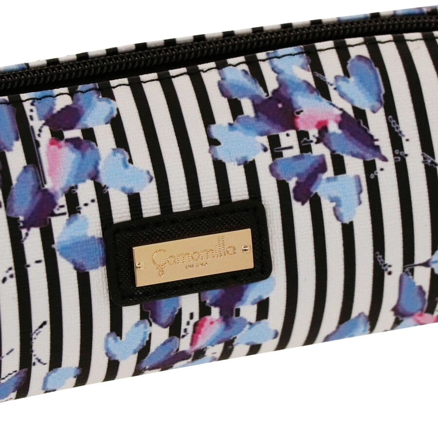 Romantico e colorato astuccio necessaire in tessuto poliuretano stampato con motivo righe e fiori all over. Chiusura con cerniera. IL logo Camomilla è impresso su targhetta centrale in metallo color oro. Elegante e funzionale allo stesso tempo, è comodo per il viaggio, il tempo libero e la palestra. Perfetto anche come portatrucchi. Ottima idea regalo per la donna che ama viaggiare.