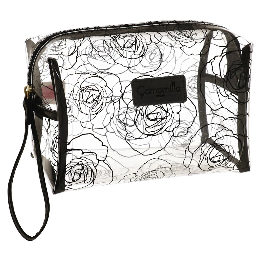 Busta necessaire in materiale PVC trasparente stampato con motivo Rose. Chiusura con cerniera. Logo Camomilla impresso su targhetta centrale in PU. IL necessaire Rosà è corredato anche di una piccola maniglietta che lo rende ideale anche come piccola pochette a mano . E’ l’Ideale per conservare i prodotti per l’igiene personale ed i cosmetici. Utile anche per i organizzare l’interno della propria valigia durante una vacanza.
