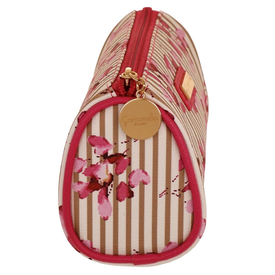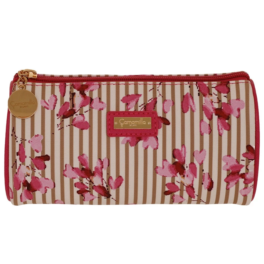 Capiente e colorata busta necessaire in tessuto poliuretano stampato con motivo righe e fiori all over. Chiusura con cerniera. IL logo Camomilla è impresso su targhetta centrale in metallo color oro. Elegante e funzionale allo stesso tempo, è comodo per il viaggio, il tempo libero e la palestra. Perfetto anche come portatrucchi. Ottima idea regalo per la donna che ama viaggiare.