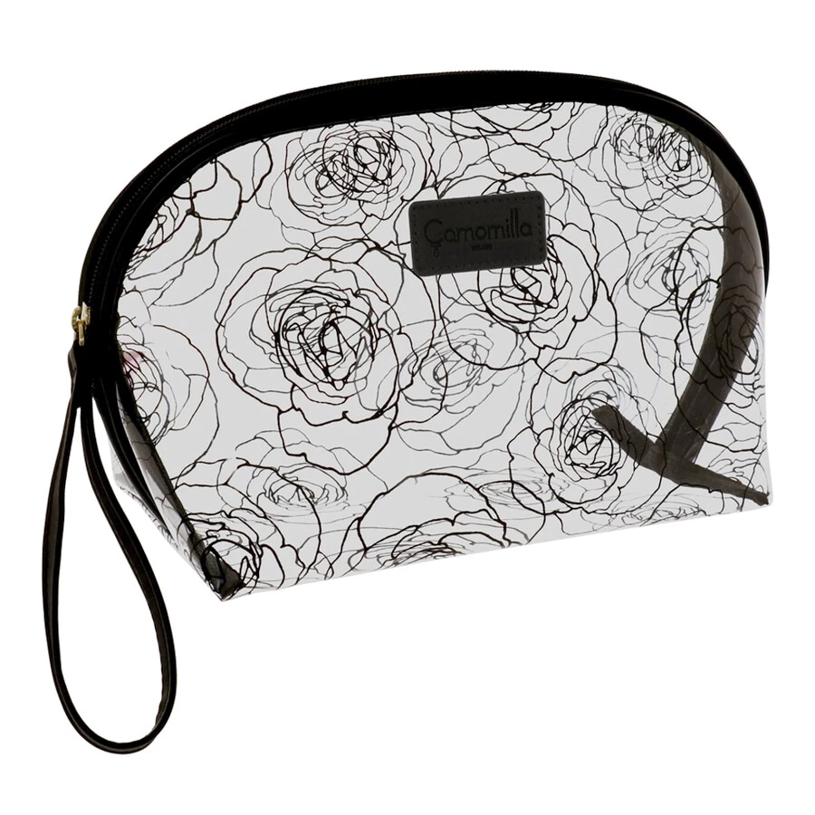 Pochette in materiale PVC trasparente stampato con motivo Rose. Chiusura con cerniera. Logo Camomilla impresso su targhetta centrale in PU. IL necessaire Rosà è corredato anche di una piccola maniglietta che lo rende ideale anche come piccola pochette a mano . E’ l’Ideale per conservare i prodotti per l’igiene personale ed i cosmetici. Utile anche per i organizzare l’interno della propria valigia durante una vacanza.
