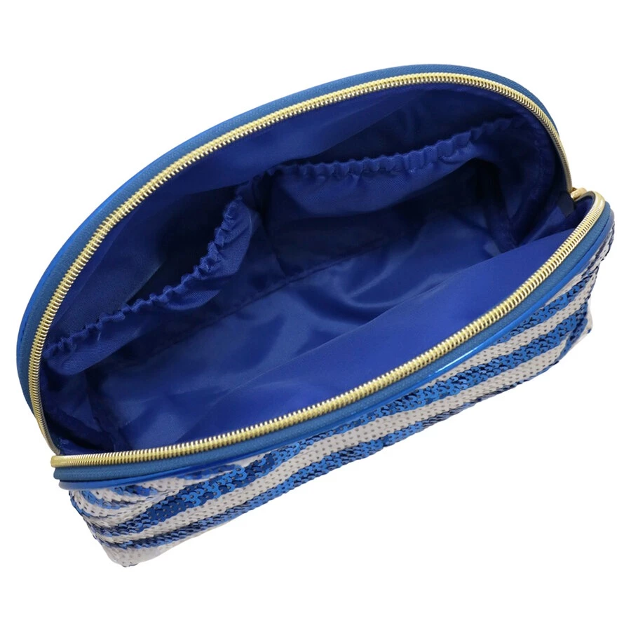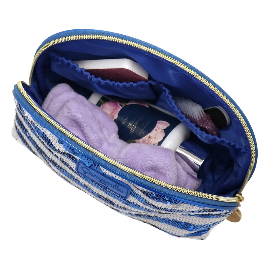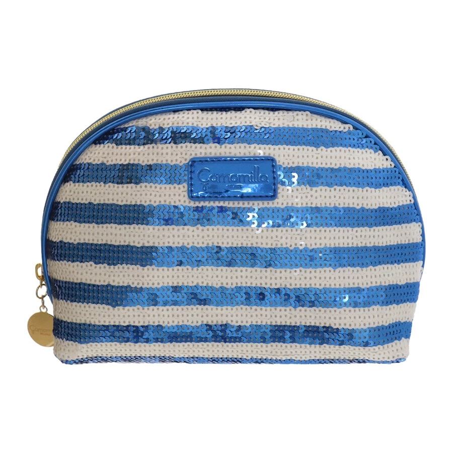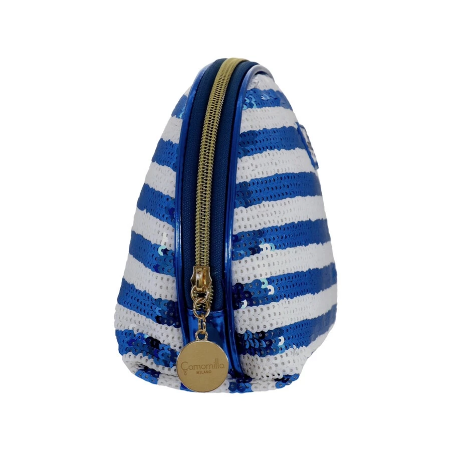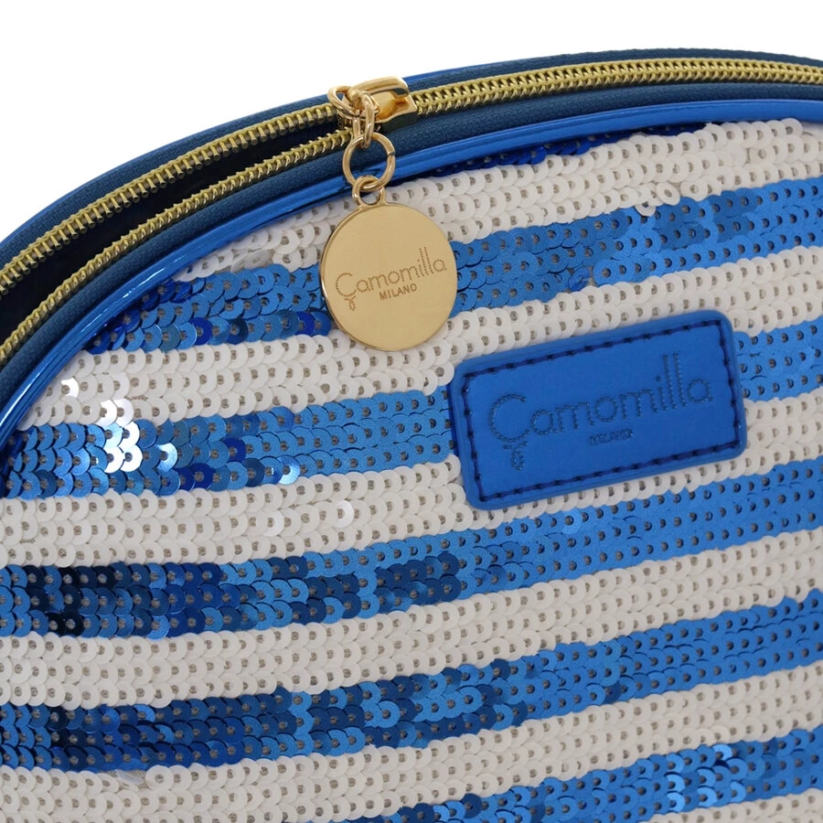 IL pouch L Riccione è una capiente e colorata trousse in tessuto poliestere decorato con piccole paillettes luccicanti a formate un motivo a righe. Chiusura con cerniera dal tiretto decorato con medaglietta in metallo color oro, logata camomilla. IL logo Camomilla è impresso su targhetta centrale in materiale PU tonale con il corpo del beauty, effetto metal. L’interno è in tessuto poliestere tinta unita ed è organizzato con una doppia taschina p.oggetti rifinita con elastico. Sfiziosa e funzionale allo stesso tempo, è una busta perfetta come portatrucchi, porta articoli da toeletta, o per organizzare piccoli oggetti all’interno della propria valigia quando si parte per una bella vacanza . Ottima idea regalo per la donna che ama viaggiare e che dà importanza ai dettagli.