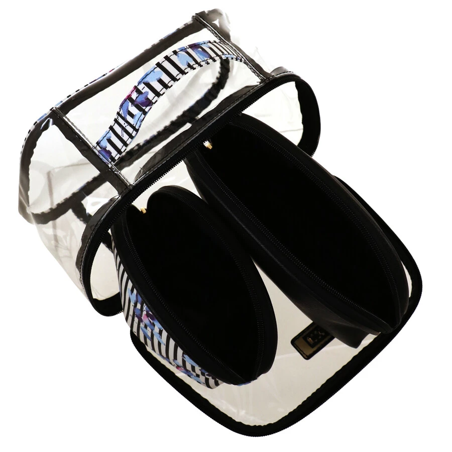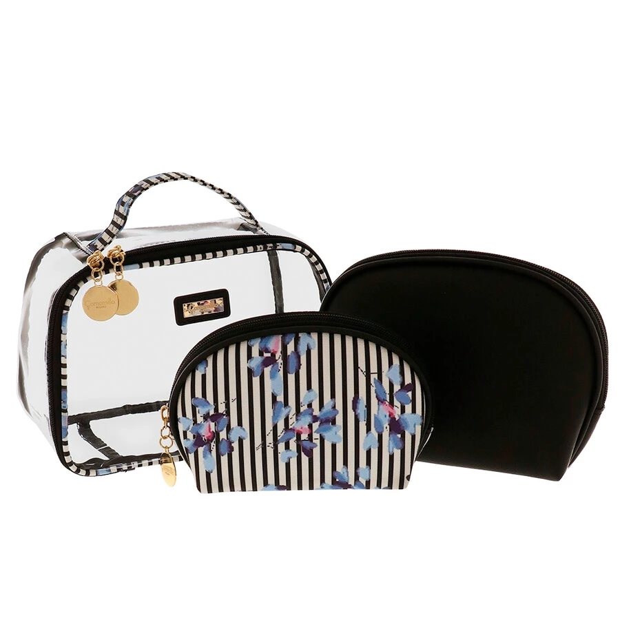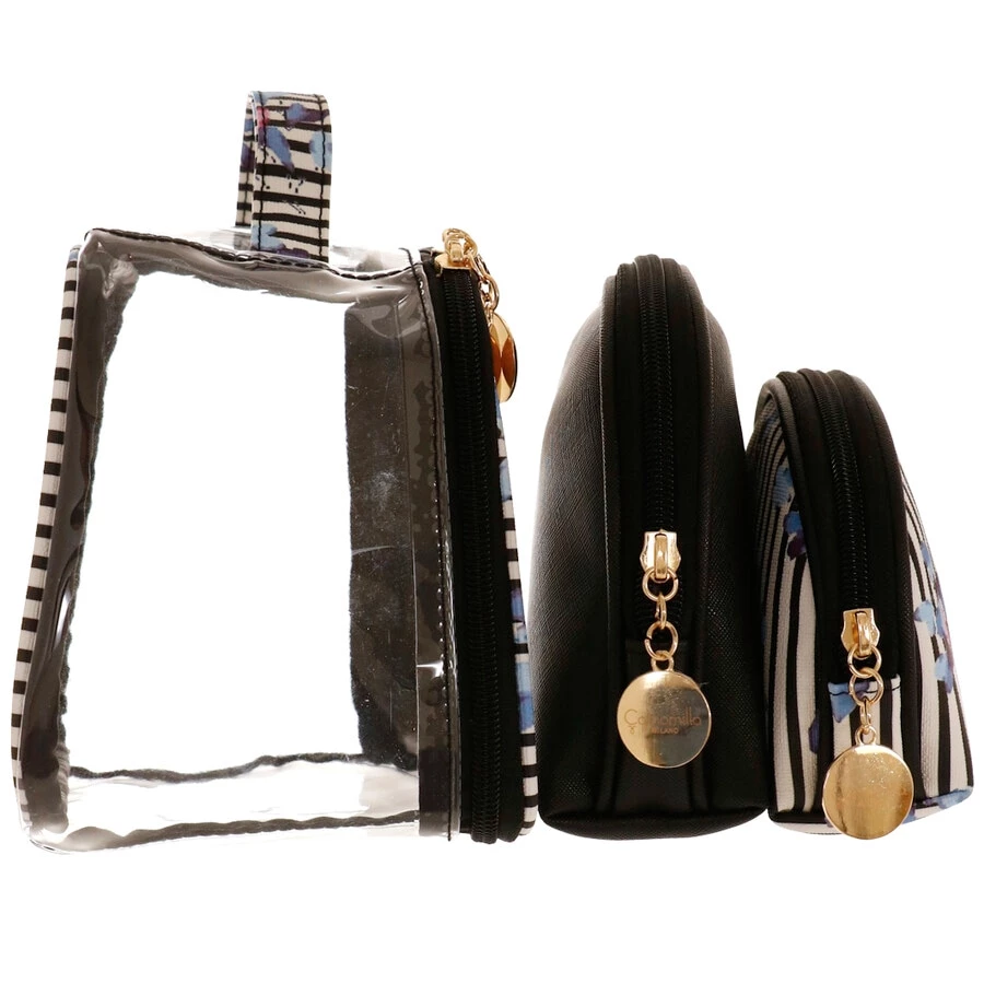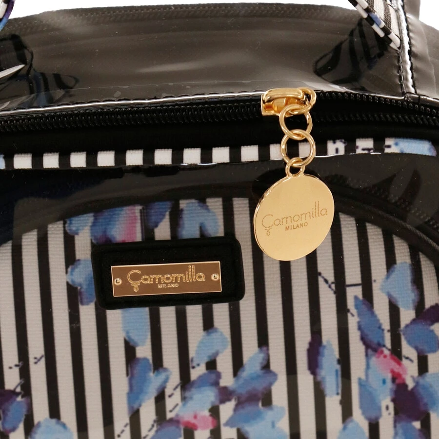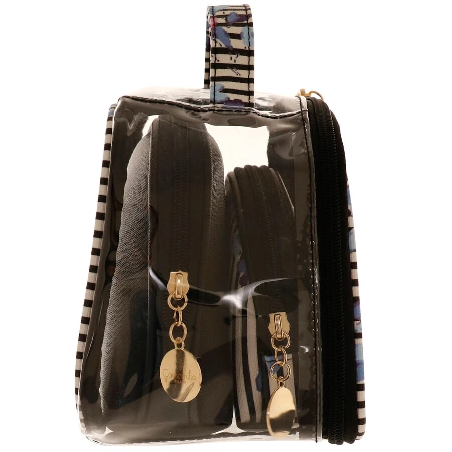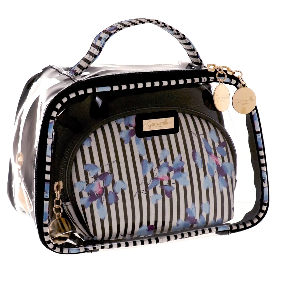 Il vanity set S 3 beauty Lerici by Camomilla Milano è un delicato e romantico set composto da un beauty case con manici in PVC trasparente che racchiude al suo interno 2 bustine tonde di diverse dimensioni in materiale poliuretano stampato con motivo righe e fiori di ciliegio allover. Il beauty case più grande è in PVC trasparente , con dettagli e maniglie superiori in poliuretano stampato ; il logo Camomilla è stampigliato sulla targhetta centrale in PU . Sia il vanity case che le 2 pochettes sono chiuse con cerniera. Metallerie in color oro. Gli interni delle pochettes sono in tessuto poliestere tinta unita. IL set 3 beauty S Lerici è un articolo funzionale e pratico ma allo stesso tempo accattivante nei colori e nelle forme. E’ comodo per il viaggio, il tempo libero e la palestra.Ecco le misure delle 2 pochettes interne: M:14,5x21x6 – S:11x18x5,5