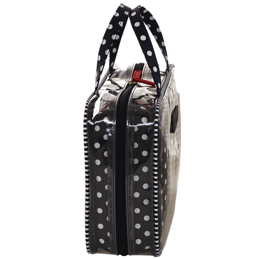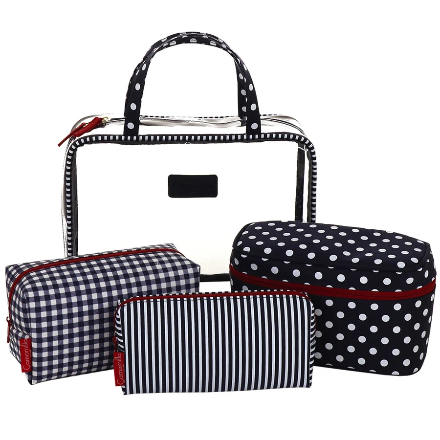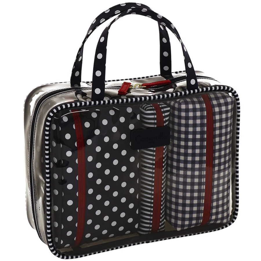 Il vanity set 3 pochettes St.Maxime by Camomilla Milano è uno sfizioso e romantico set composto da un beauty case con manici in PVC trasparente che racchiude al suo interno 3 trousse di diverse dimensioni in tessuto poliestere stampato con motivo quadretto vichy , righe e poi. Il beauty case più grande è in PVC trasparente , con dettagli e maniglie superiori in poliuretano stampato a righine e quadretti; il logo Camomilla è stampigliato sulla targhetta centrale in PU blu. Sia il vanity case che le 3 pochettes sono chiuse con cerniera. Metallerie in color oro. IL set 3 pochettes St.Maxime è un articolo funzionale e pratico ma allo stesso tempo accattivante nei colori e nelle forme. E’ comodo per il viaggio, il tempo libero e la palestra. Il beauty più grande è l’ideale per la spiaggia, in quanto completamente impermeabile. Ecco le misure delle 3 pochettes interne: L: 12x19x9 – M: 9×17,5×8 – S: 8x18x3,5