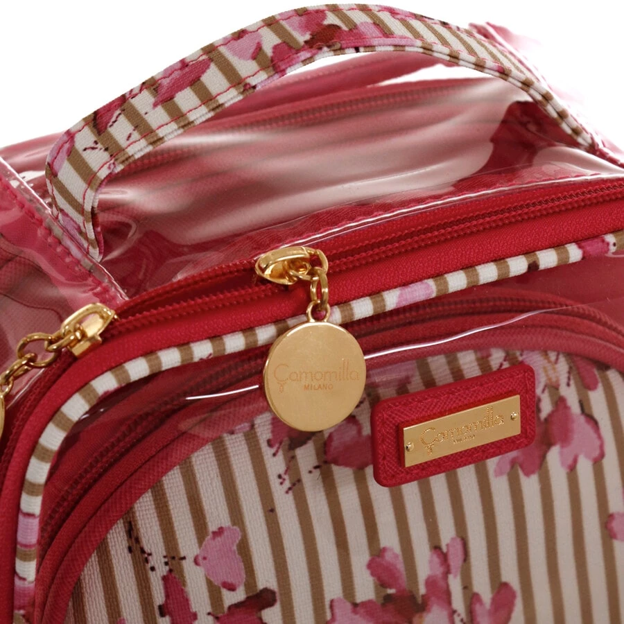 Il vanity set S 3 beauty Lerici by Camomilla Milano è un delicato e romantico set composto da un beauty case con manici in PVC trasparente che racchiude al suo interno 2 bustine tonde di diverse dimensioni in materiale poliuretano stampato con motivo righe e fiori di ciliegio allover. Il beauty case più grande è in PVC trasparente , con dettagli e maniglie superiori in poliuretano stampato ; il logo Camomilla è stampigliato sulla targhetta centrale in PU . Sia il vanity case che le 2 pochettes sono chiuse con cerniera. Metallerie in color oro. Gli interni delle pochettes sono in tessuto poliestere tinta unita. IL set 3 beauty S Lerici è un articolo funzionale e pratico ma allo stesso tempo accattivante nei colori e nelle forme. E’ comodo per il viaggio, il tempo libero e la palestra.Ecco le misure delle 2 pochettes interne: M:14,5x21x6 – S:11x18x5,5