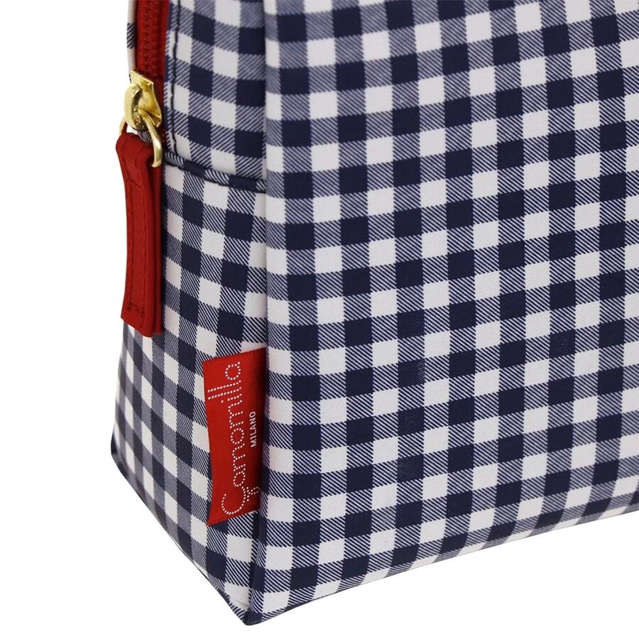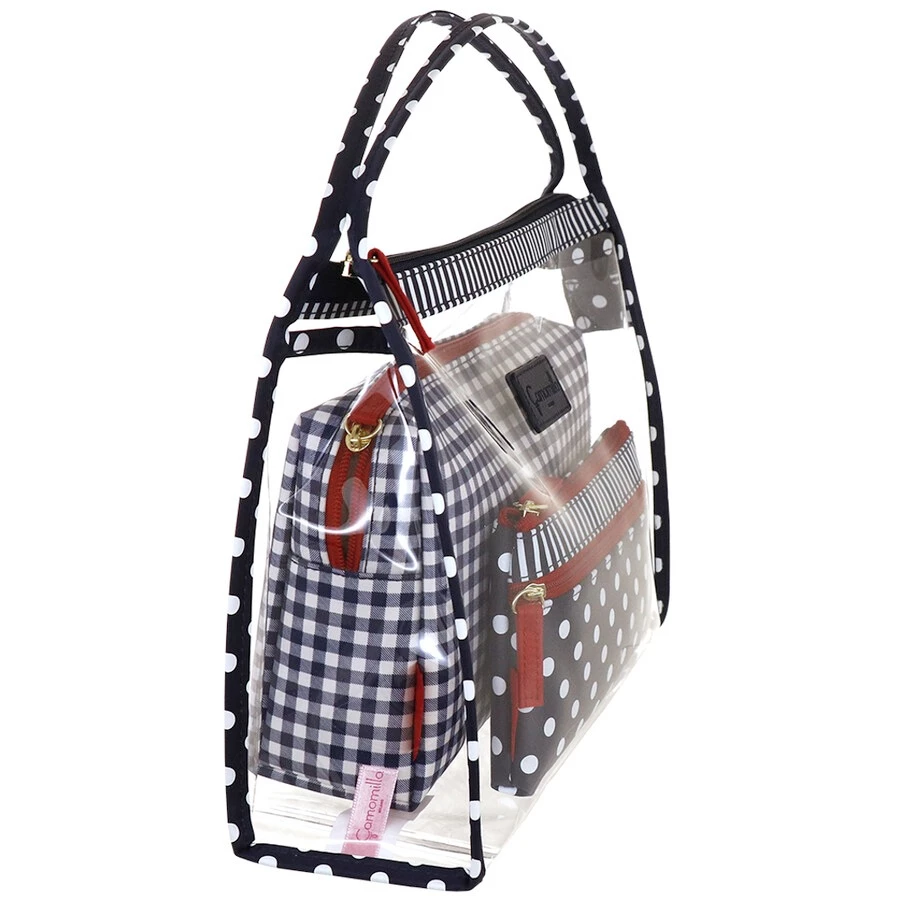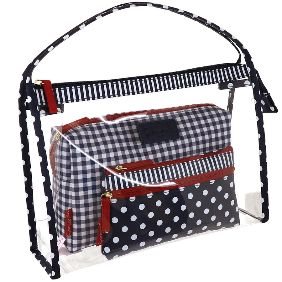 Set 4 buste composto da una grande trousse in materiale PVC trasparente con comodi manici e rifiniture in poliuretano, che racchiude al suo interno 3 buste più piccole in materiale poliuretano stampato motivo a pois, righe e quadretti. Chiusura c/cerniera e targhetta centrale in poliuretano tinta unita con logo Camomilla stampigliato. Sfizioso e funzionale allo stesso tempo, è un set comodo per il viaggio ed il tempo libero. Perfetto anche come portatrucchi e grazie ai suoi manici può essere utilizzato anche come pratica borsettina a mano. Dimensioni delle 3 buste interne: S: cm. 13,50 x 23,00 x 7,00 , 2pz XS: 10×18,5×1,5 cm