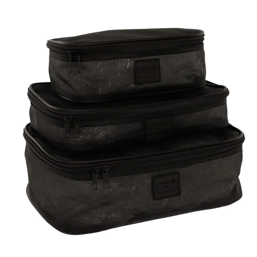 Set 3 trousse in materiale Più microrete. Chiusura c/zip e targhetta logo tonale Camomilla. Ideali per conservare i prodotti per l’igiene personale, i cosmetici. Utili anche per i organizzare l’interno della propria valigia durante una vacanza. Perfette per la spiaggia, la microforatura del materiale permette alla sabbia di defluire.