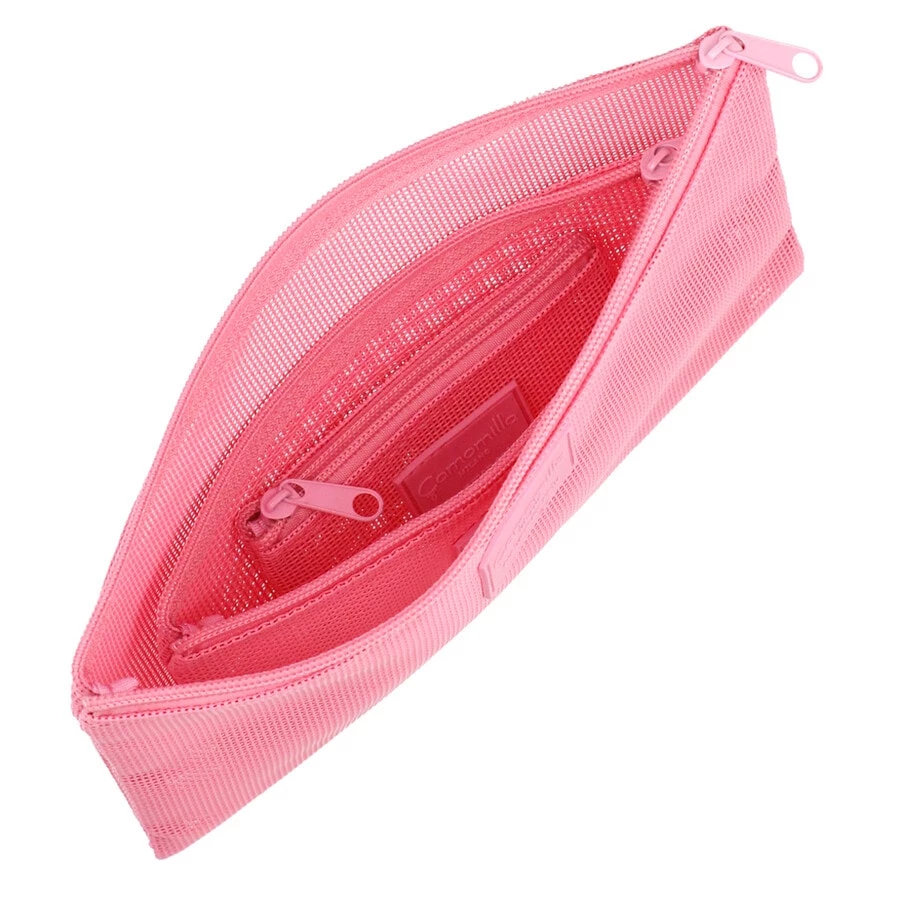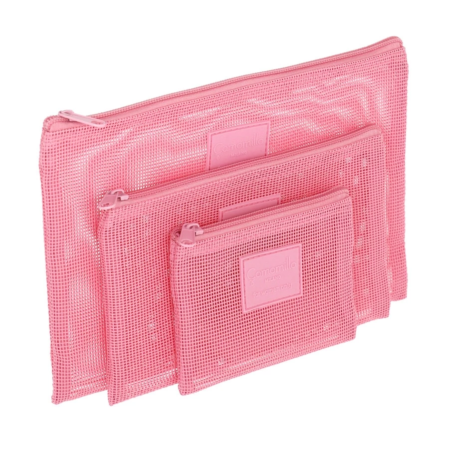 Set 3 Buste in materiale Più microrete. Chiusura c/zip e targhetta logo tonale Camomilla. Ideali per conservare i prodotti per l’igiene personale, i cosmetici. Utili anche per i organizzare l’interno della propria valigia durante una vacanza. Perfette per la spiaggia, la microforatura del materiale permette alla sabbia di defluire.