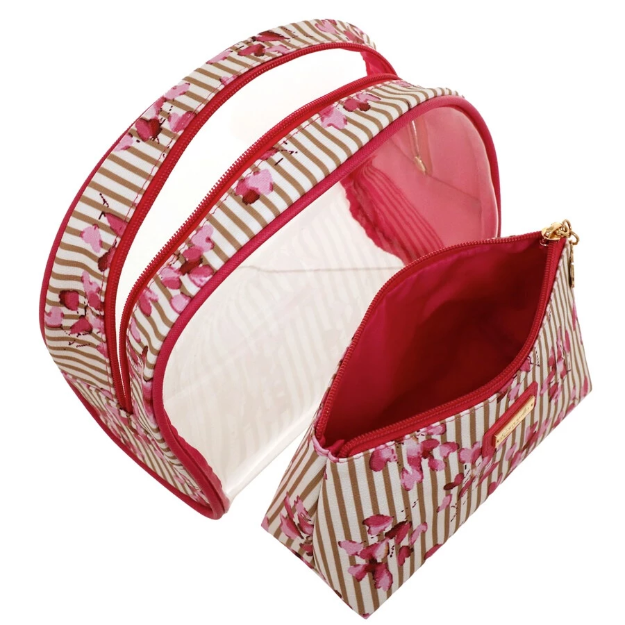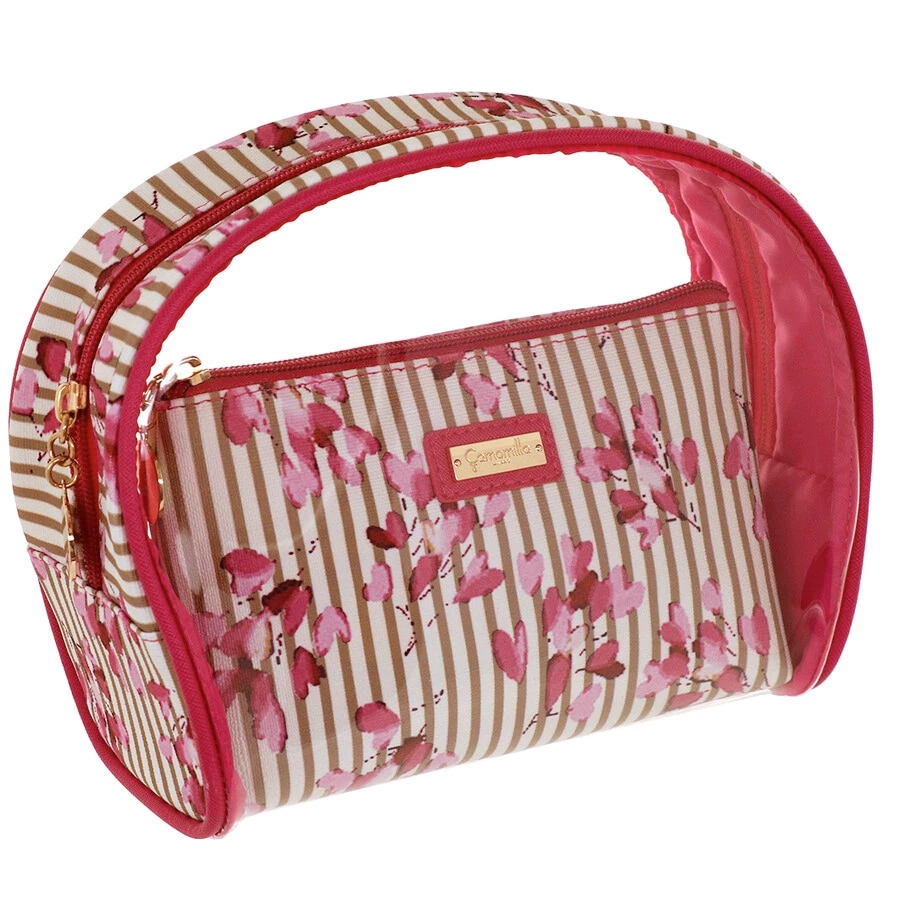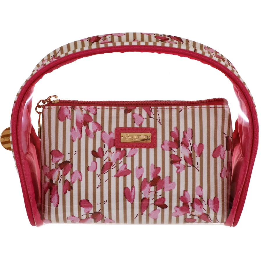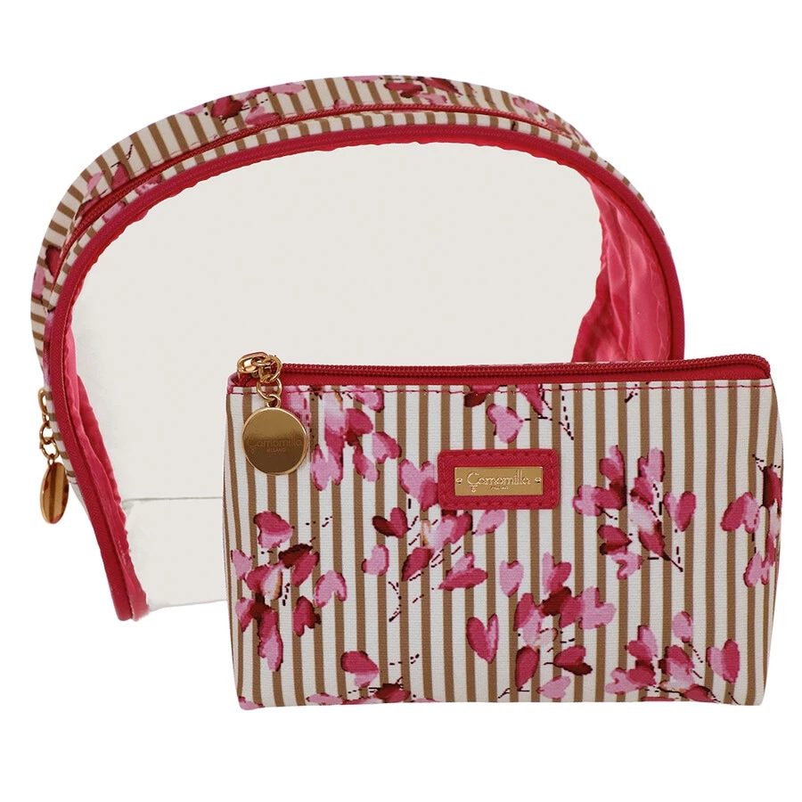 Il set 2 trousse s Lerici by Camomilla Milano è un delicato e romantico set composto da una maxi trousse tonda in materiale PVC che racchiude al suo interno 1 bustina rettangolare in materiale poliuretano stampato con motivo righe e fiori di ciliegio allover. Ila trousse più grande è in PVC trasparente , con dettagli e profili in poliuretano stampato ; il logo Camomilla è stampigliato sulla targhetta centrale in metallo . Sia il vanity case che la pochette sono chiusi con cerniera. Metallerie in color oro. L’interno della pochette è in tessuto poliestere tinta unita. IL set 2 trousse Lerici è un articolo funzionale e pratico ma allo stesso tempo accattivante nei colori e nelle forme. E’ comodo per il viaggio, il tempo libero e la palestra.