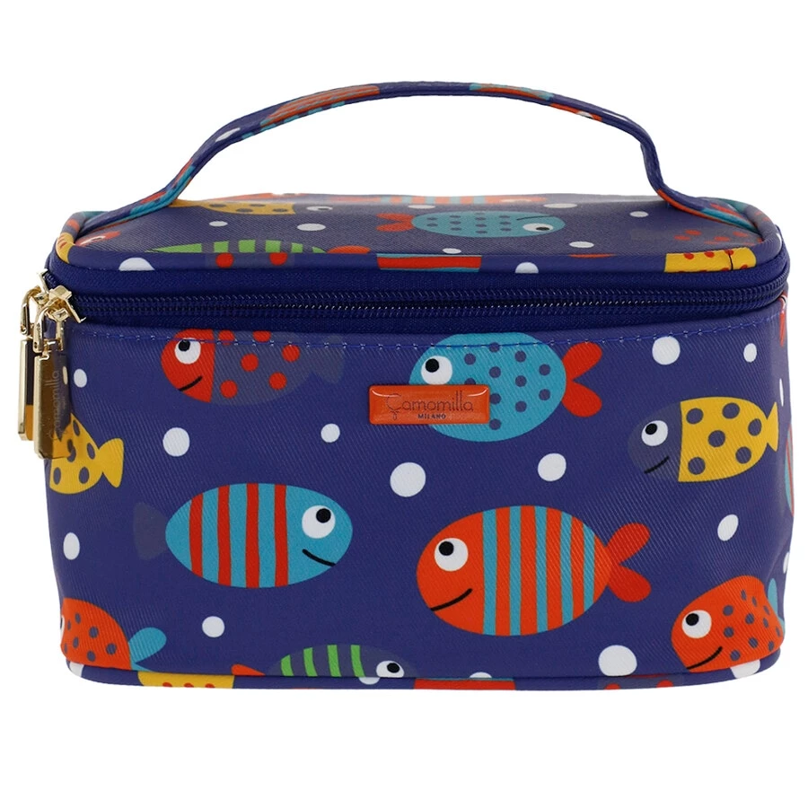 Il travel beauty case Tropea by Camomilla Milano è un simpatico e colorato beauty in tessuto poliestere stampato con pesciolini dai mille colori. Chiusura con cerniera con doppio tiretto. IL logo Camomilla è impresso su targhetta centrale in metallo smaltato color corallo. Sfizioso e funzionale allo stesso tempo, è comodo per il viaggio, il tempo libero e la palestra. Perfetto anche come portatrucchi. Ottima idea regalo per la donna che ama viaggiare.