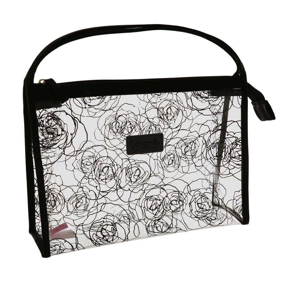 Capiente trousse in materiale PVC trasparente stampato motivo rose allover con comodi manici . Chiusura c/cerniera e targhetta centrale in poliuretano tinta unita con logo Camomilla stampigliato. Sfizioso e funzionale allo stesso tempo, è un set comodo per il viaggio ed il tempo libero. Perfetto anche come portatrucchi. Grazie ai suoi manici può essere utilizzato anche come pratica borsettina a mano. Ideale per la spiaggia in quanto completamente impermeabile.