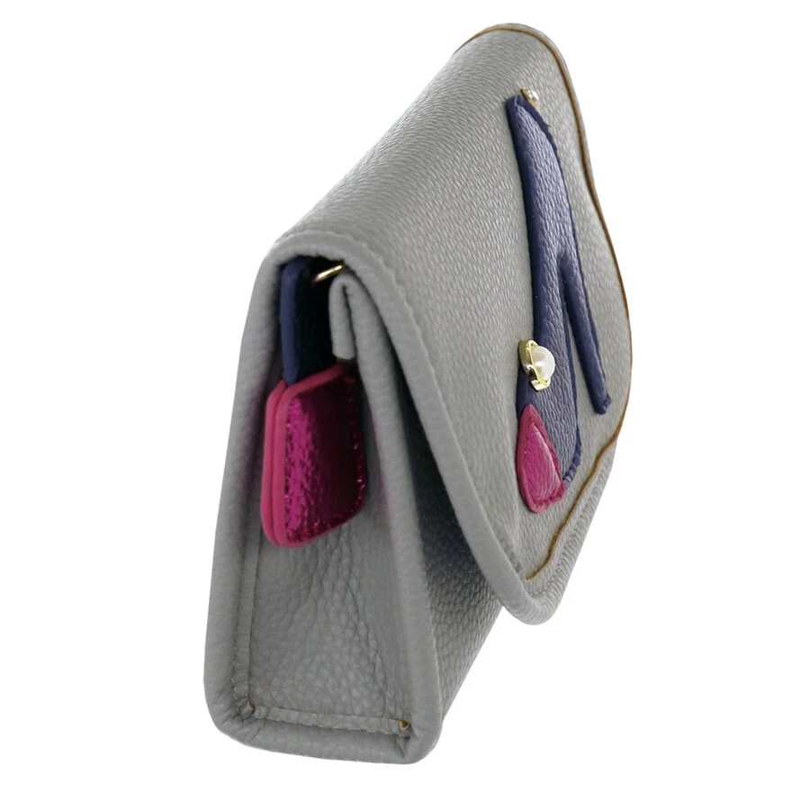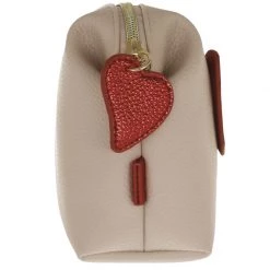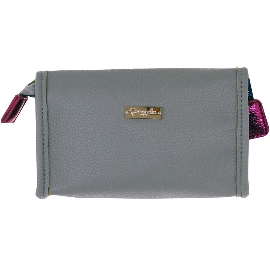 Chiusura a zip con tiretto con piccola mascot a forma di rossetto e logo Camomilla sul lato posteriore. Dotata di specchietto all’interno pateletta superiore.