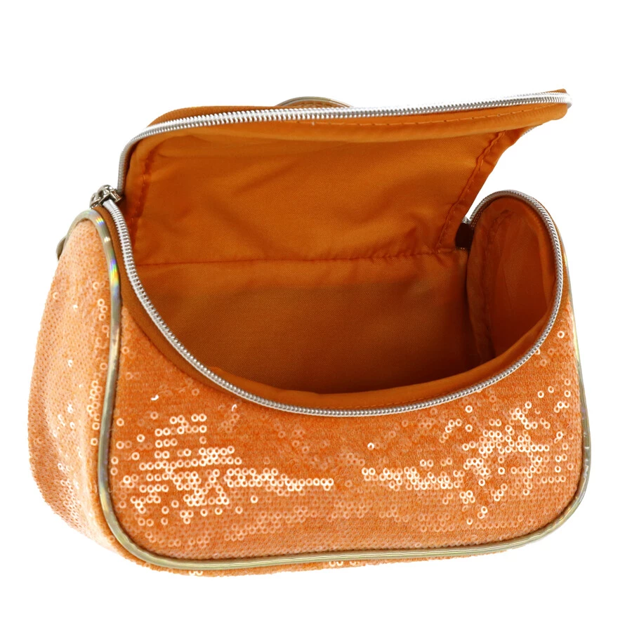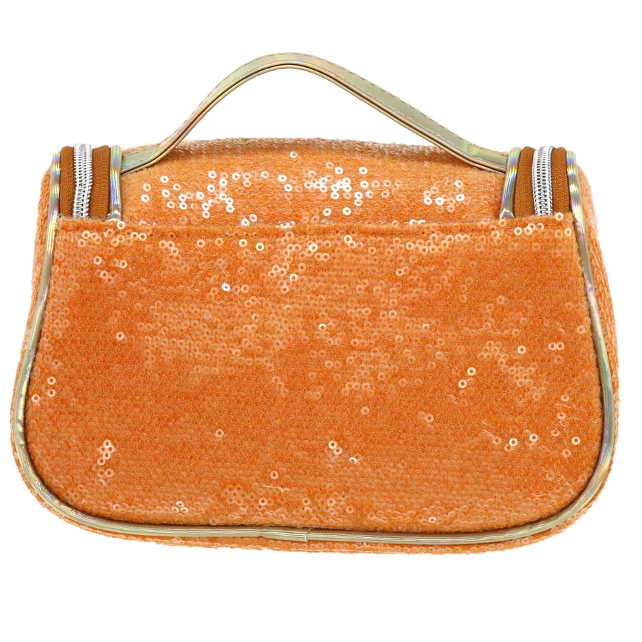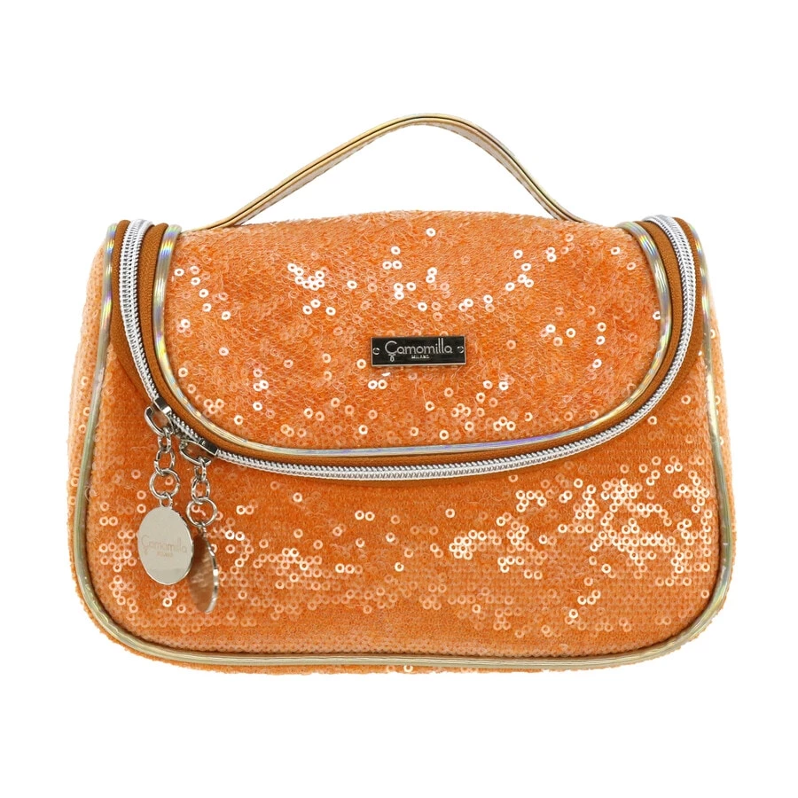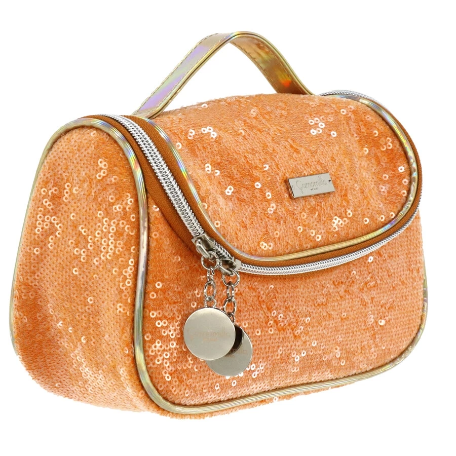 Sfizioso mini beauty case porta oggetti, dotato di pratica maniglietta in eco pelle lucida, decorato con paillettes cucite sull’intera superficie. Chiusura con zip con doppio tiretto con medaglietta Camomilla.