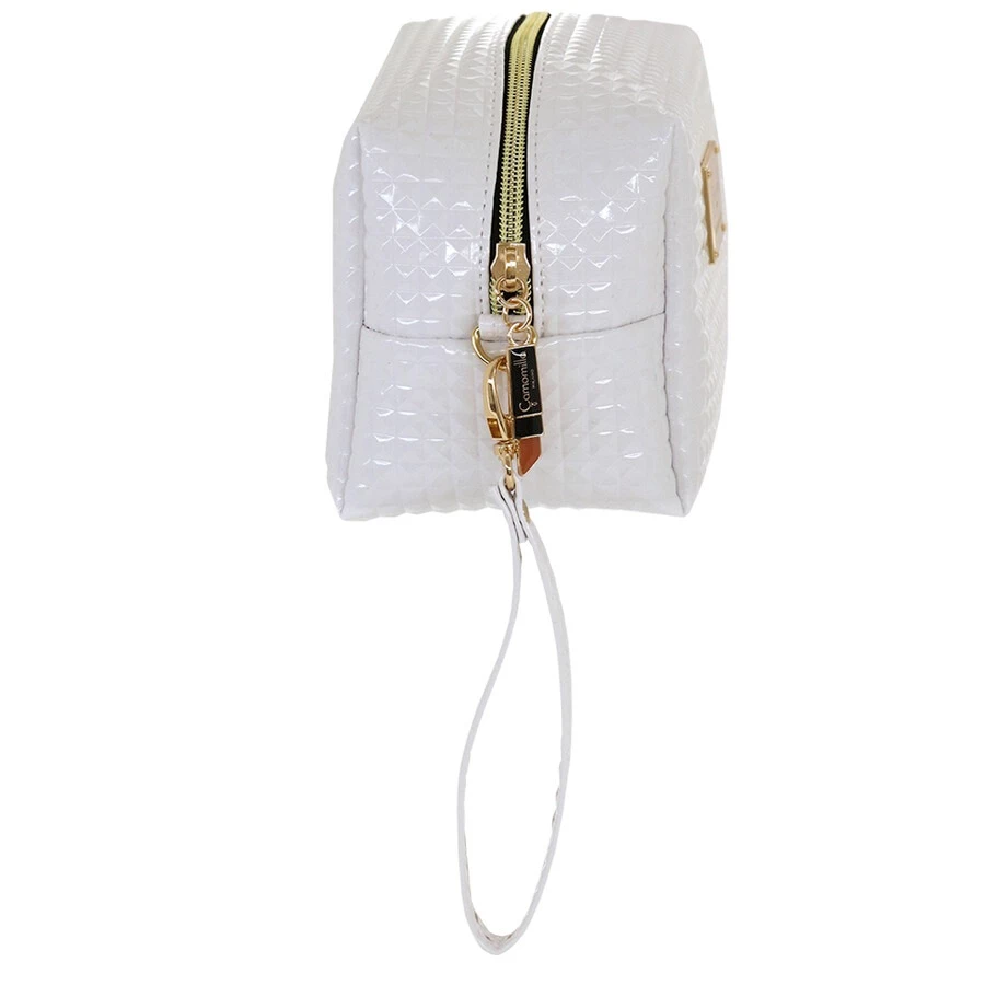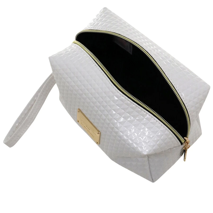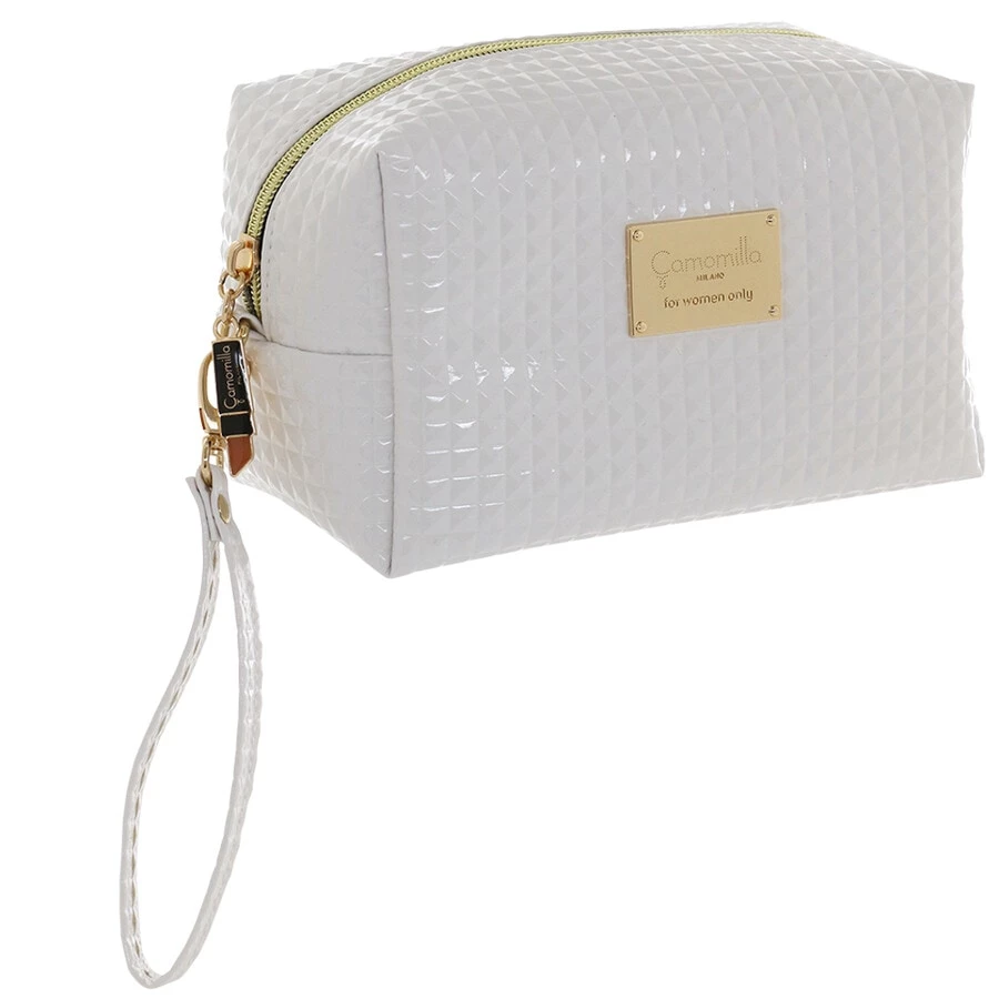 Busta necessaire in materiale PU effetto vernice con lavorazione geometrica in rilievo. Chiusura con cerniera dotata di tiretto con piccola targhetta a logo “Camomilla”. Logo Camomilla “for women only” impresso su targhetta centrale in metallo color oro. IL vanity case L Citylife è corredato anche di una piccola maniglietta removibile che lo rende ideale anche come piccola pochette a mano . E’ l’Ideale per conservare i prodotti per l’igiene personale ed i cosmetici. Utile anche per i organizzare l’interno della propria valigia durante una vacanza.