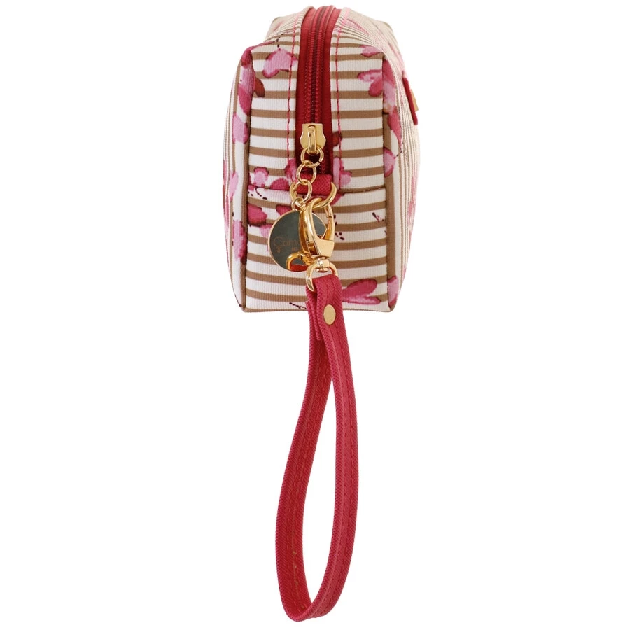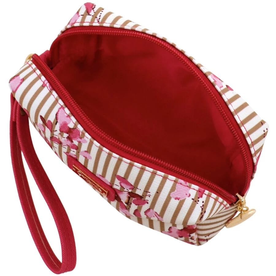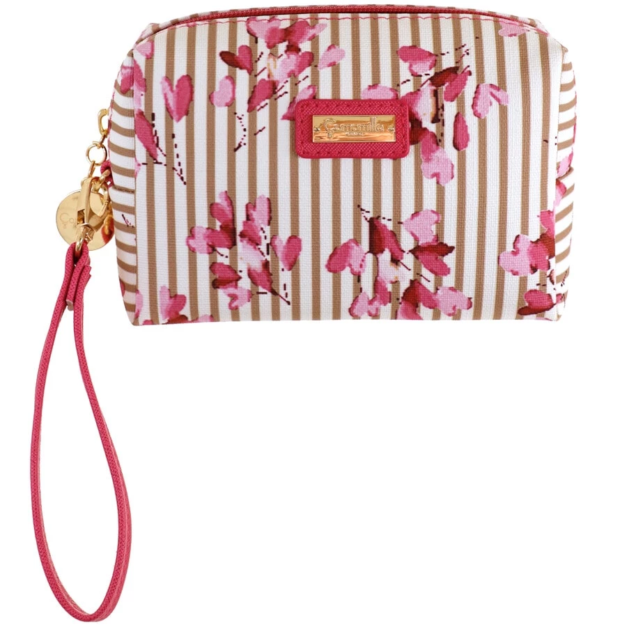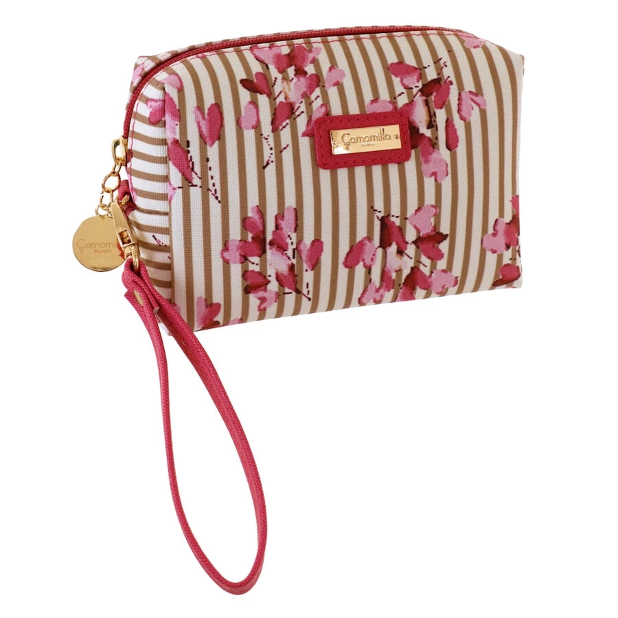Busta necessaire in materiale poliuretano stampato con motivo righe e fiori di ciliegio allover. Chiusura con cerniera dotata di tiretto con medaglietta tonda a logo “Camomilla”. Logo Camomilla impresso su targhetta centrale in metallo color oro. IL vanity case M Lerici è corredato anche di una piccola maniglietta removibile che lo rende ideale anche come piccola pochette a mano . E’ l’Ideale per conservare i prodotti per l’igiene personale ed i cosmetici. Utile anche per i organizzare l’interno della propria valigia durante una vacanza.