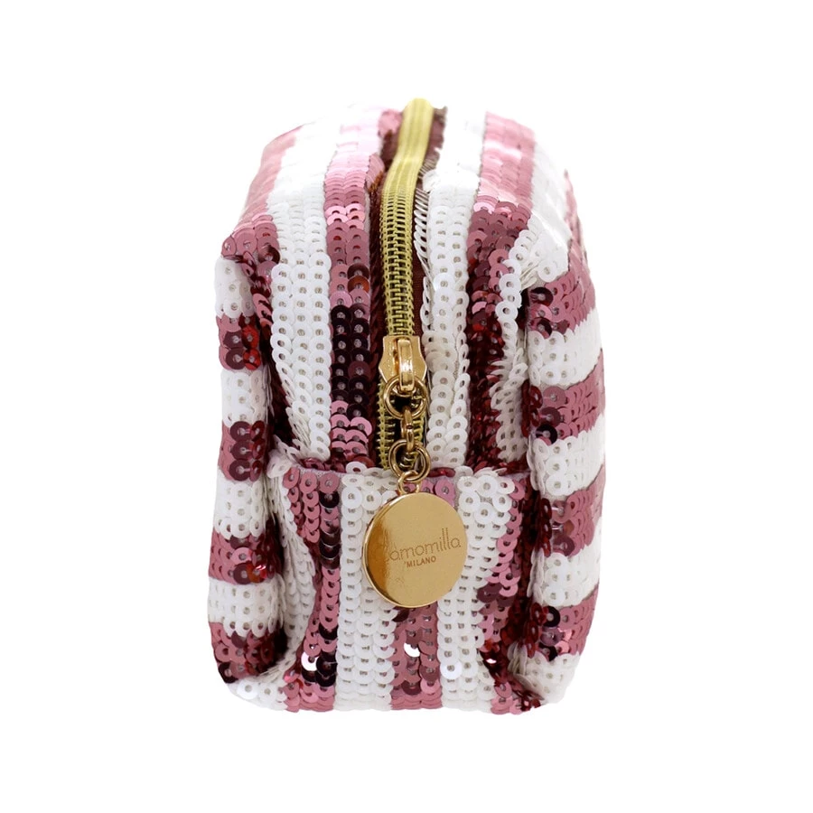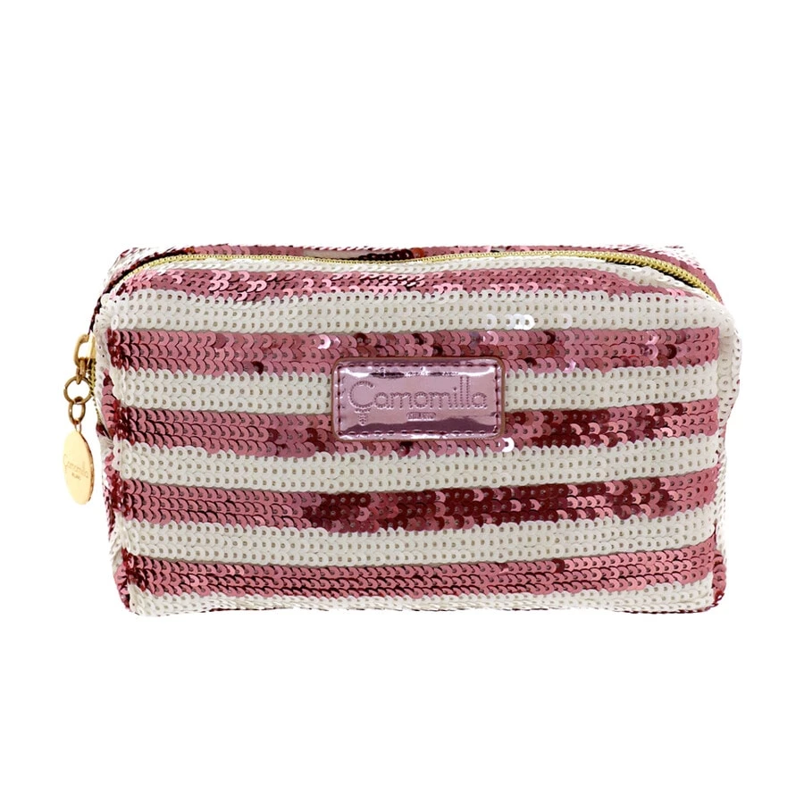 La busta vanity Riccione è una brillante e colorata trousse in tessuto poliestere decorato con piccole paillettes luccicanti a formate un motivo a righe. Chiusura con cerniera dal tiretto decorato con medaglietta in metallo color oro, logata camomilla. IL logo Camomilla è impresso su targhetta centrale in materiale PU tonale con il corpo del beauty, effetto metal. L’interno è in tessuto poliestere tinta unita. Sfiziosa e funzionale allo stesso tempo, è perfetta come portatrucchi, o per organizzare piccoli oggetti all’interno della propria valigia quando si parte per una vacanza. Ottima idea regalo per la donna che ama viaggiare e che dà importanza ai dettagli.
