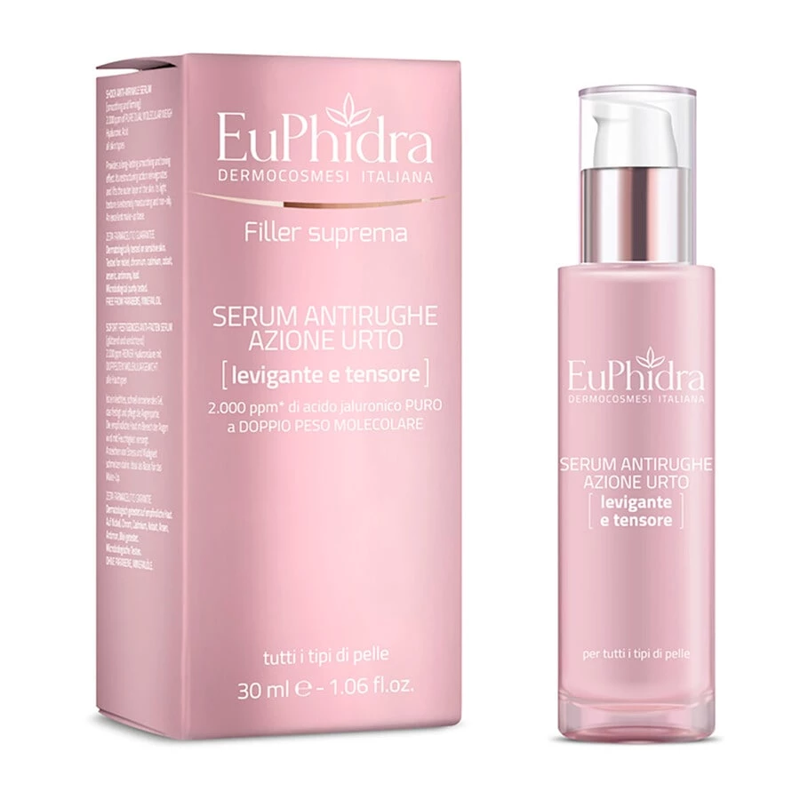 Acido jaluronico a alto e basso peso molecolare: le concentrazioni dei due pesi molecolari sono bilanciate per ottenere una simultanea azione di riempimento e distensione delle rughe e di stimolazione della struttura e della compattezza cutanee. Gli altri ingredienti cosmetici e le diverse texture, rispondono alle esigenze di tutti i tipi di pelle.Serum Antirughe Azione Urto leviga la pelle, distende le rughe, uniforma il micro-rilievo cutaneo.